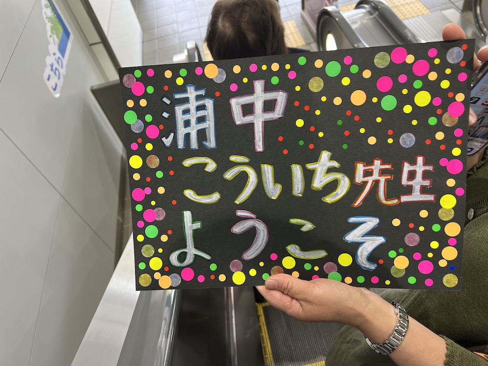 駅に到着すると、先生がこちらを作って待っていてくれたのですが・・・僕がそれを見つける前に先生から「浦中先生〜〜〜」と素敵な笑顔で駆けつけてくれました。