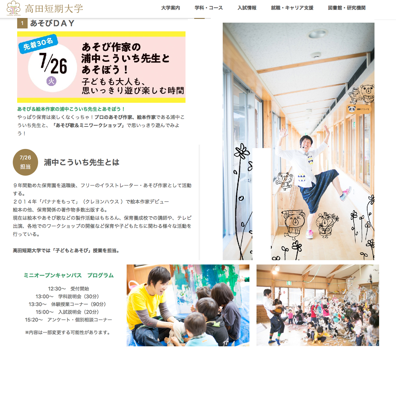 浦中こういちとあそぼう!高田短期大学オープンキャンパス7月26日開催!
