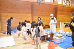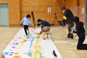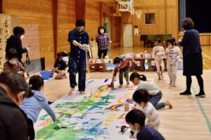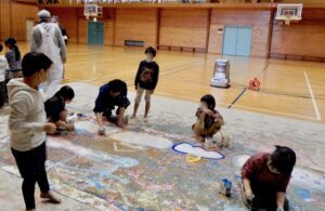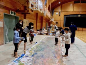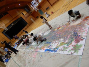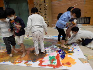 初めの端っこに描く姿、身体全部で感じ動く姿、綺麗にしよや〜と取り組む姿、一人一人の世界が広がっていく、繋がっていく時間。2時間という時間、休憩もせずに黙々と取り組む子どもたち。思いっきり楽しんで取り組む時間はなんの時間にも変えることができません。こんな時間がいろんな小学校、いや、保育園から小学校に繋がり、中学校にも繋がっていくといいなと感じます。