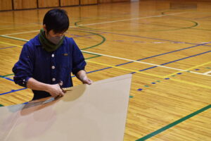 なんと今回は畳1畳分の大きさのダンボール板8枚を繋げます。完成した作品は屏風のようになるってわけなんですよ。